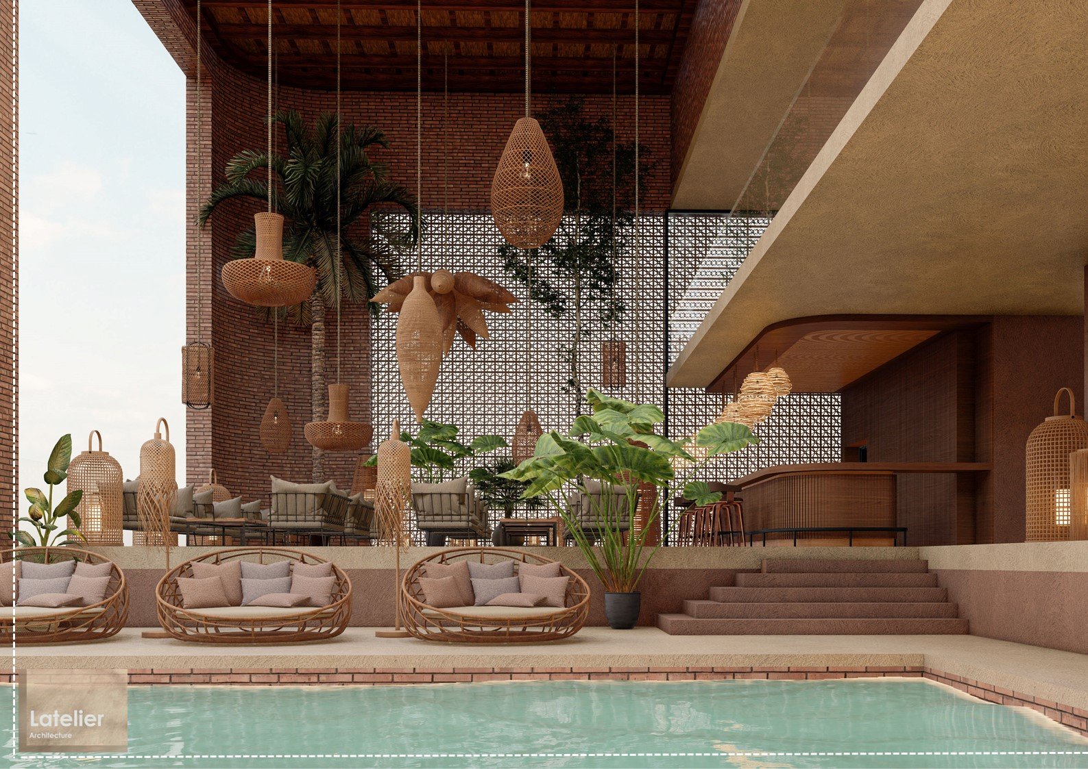 L’architecture compose un univers chaleureux et enveloppant, fait de matières naturelles, de lumières tamisées et de végétation généreuse. Les volumes s’organisent autour de zones de repos, de convivialité et de contemplation, où l’eau, l’ombre et la texture des matériaux participent à une sensation immédiate d’apaisement.